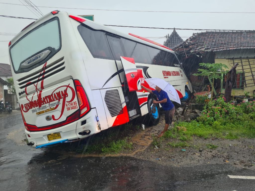 jatimnow.com - Bus Sindoro Satriamas mengalami kecelakaan tunggal dan menabrak sebuah rumah milik Suratno di Jalan Raya Ring Road Kentangan-Sukomoro, Kabupaten Magetan, Senin (18/1/2021).