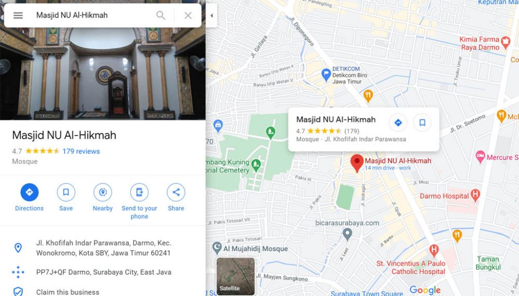 Pengguna bisa mengetahui jika sedang melakukan pencarian alamat sebuah Masjid Al Hikmah di Darmo, Kecamatan Wonokromo, Jawa Timur. Di alamat masjid itu juga lengkap terdapat nomor kodepos 60241 yang tertera.