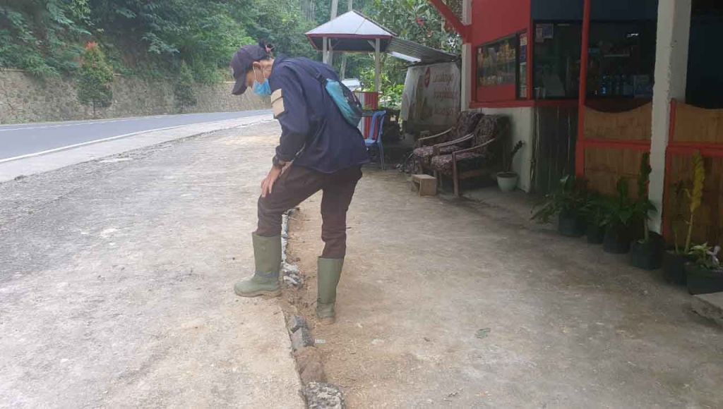 "Dimensi retakan bervariasi, antara panjang 46 meter, lebar rekahan mulai 3 sentimeter sampai 15 sentimeter yang mengakibatkan struktur bangunan retak/rusak. Sepanjang pinggir jalan area warung juga ada retakan dan tanah ambles," lanjutnya.