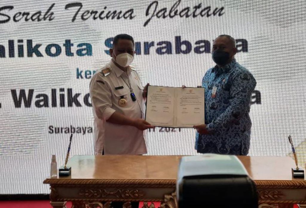 jatimnow.com - Whisnu Sakti Buana serah terima jabatan kepada Hendro Gunawan selaku Pelaksana Harian (Plh) Wali Kota Surabaya, Rabu (17/2/2021).