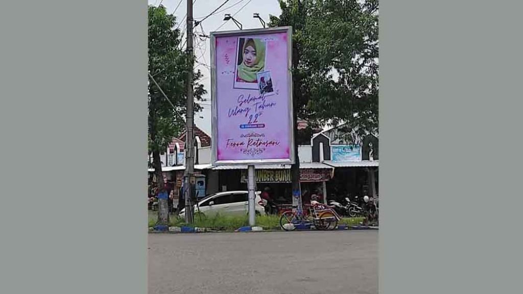 Pantauan di lokasi, baliho yang terpasang di perempatan Pasar Pon Ponorogo itu berukuran 4 meter x 2 meter dengan warna pink. Ada dua foto dan bertulis 'Selamat Ulang Tahun 22, Fera Retnosari'.