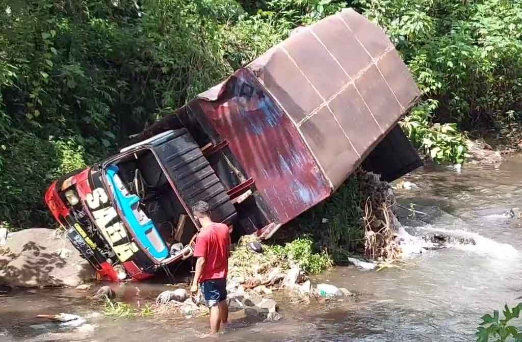 Kondisi jalanan yang menurun membuat truk tronton tersebut menabrak truk boks hingga terjun ke sungai sedalam 15 meter.