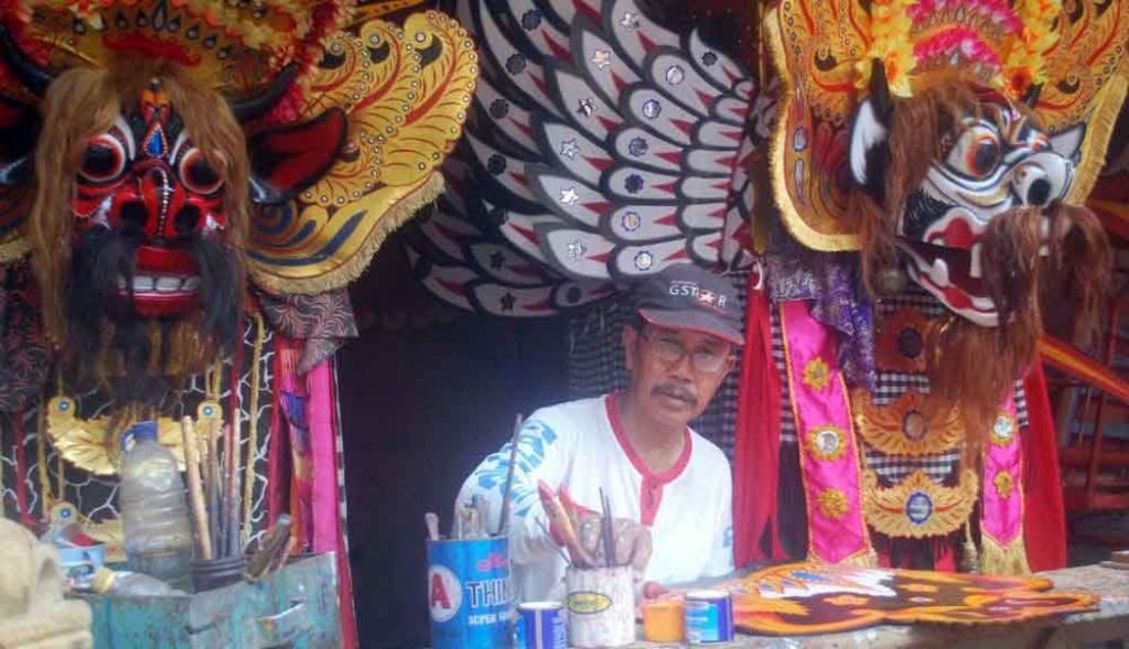 Dengan menggunakan cat, ia kemudian mewarnai wajah Barong. Uniknya, meski proses pengecatan dilakukan secara manual hasil akhirnya bisa mulus seperti menggunakan pewarnaan menggunakan kompresor.
