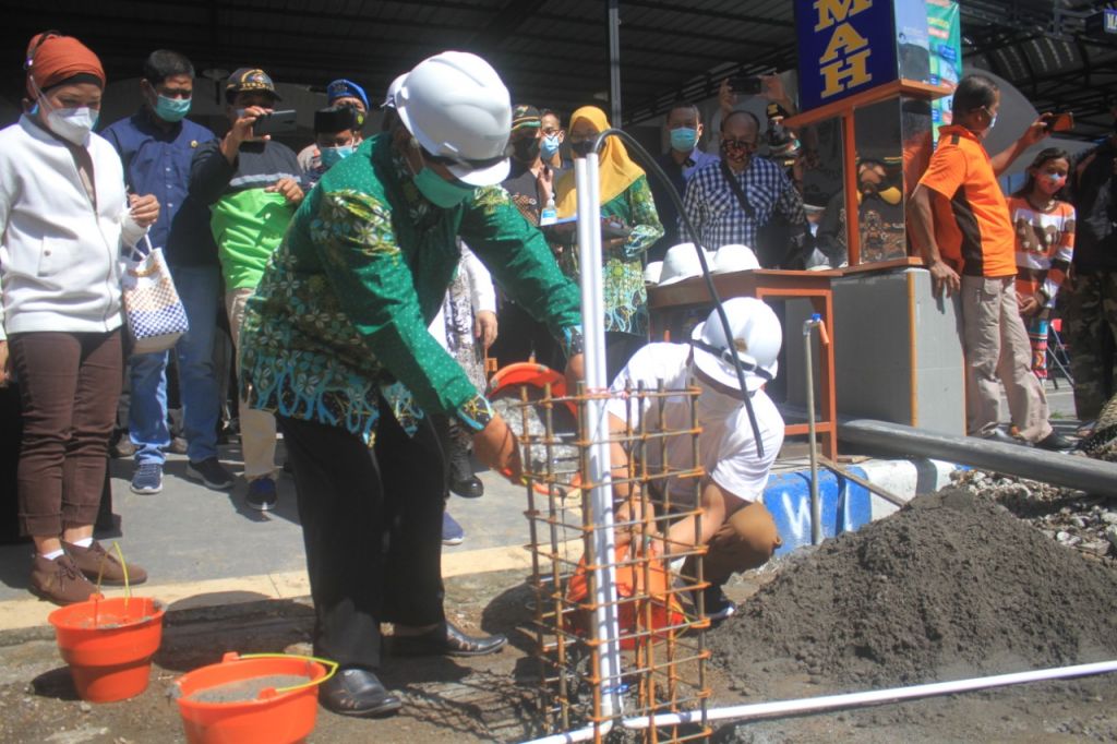 jatimnow.com - Bupati Ponorogo, Sugiri Sancoko dan Wakil Bupati, Lisdyarita meletakkan batu pertama dalam penataan wajah atau face off Jalan Cokroaminoto, Jumat (16/4/2021).