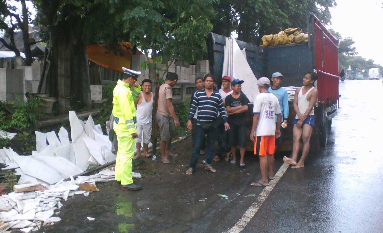 jatimnow.com - Truk bermuatan keramik marmer granit DK 9413 FH terguling di Jalan Raya Pantura Desa Sumberanyar, Kecamatan Wongorejo, Banyuwangi, Sabtu (3/2/2018).