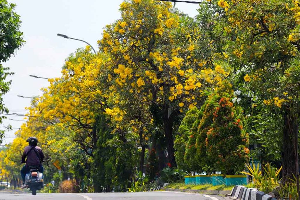 jatimnow.com - Bunga Tabebuya yang berwarna kuning bermekaran lagi di Kota Surabaya di hari ketiga Idul Fitri 1442 H. Mekarnya bunga ini semakin mempercantik jalan protokol Surabaya pada saat lebaran.