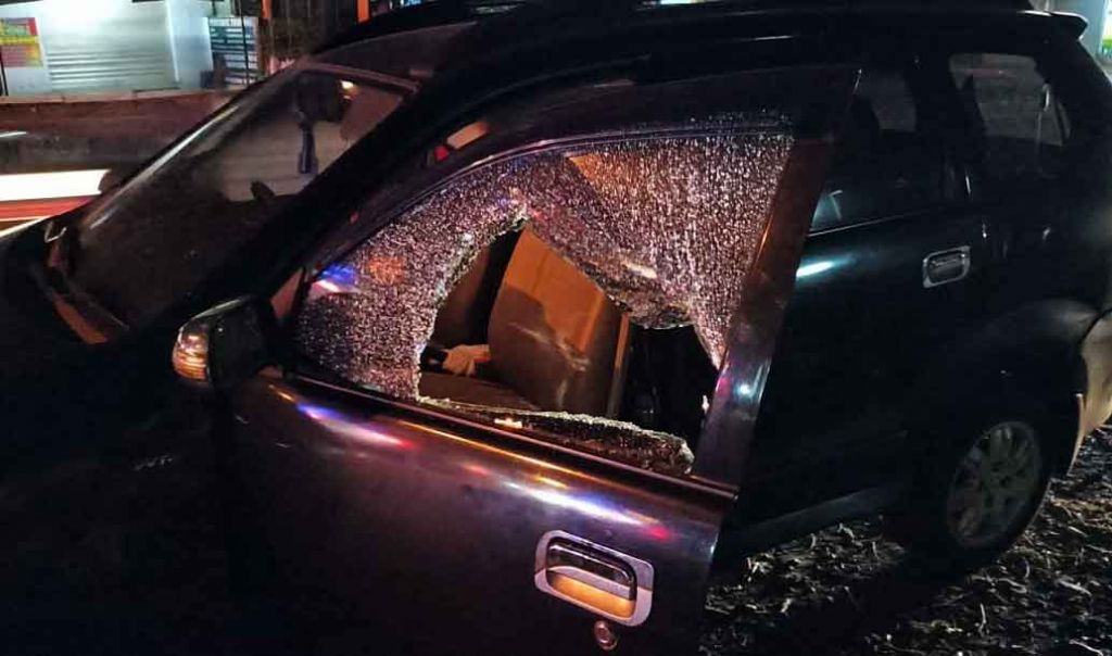 Setelah selesai makan, mereka kagetnya mengetahui pintu depan mobil sebelah kiri kondisi kacanya sudah pecah.