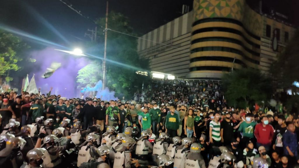 Selain itu, aparat anti huru-hara berseragam lengkap juga bersiaga di garda depan berhadapan langsung dengan para Bonek Mania.
