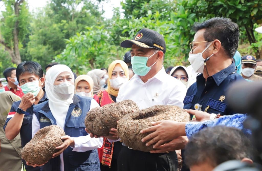 Untuk memberikan penguatan komoditas porang, Gubernur Jawa Timur Khofifah Indar Parawansa bersama Menteri Pertanian RI Syahrul Yasin Limpo dan Menko Bidang Pembangunan Manusia dan Kebudayaan (PMK) Muhadjir Effendy melakukan gerakan panen porang di Desa Klangon, Kecamatan Saradan, Kabupaten Madiun.