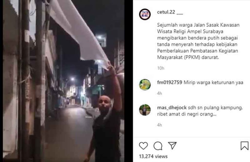 Video berdurasi 2 menit 39 detik yang diunggah oleh akun @cetul.22 dengan tulisan 'sejumlah warga Jalan Sasak Kawasan Wisata Religi Ampel Surabaya mengibarkan bendera putih sebagai tanda menyerah terhadap kebijakan Pemberlakuan Pembatasan Kegiatan Masyarakat (PPKM) darurat' itu telah dilihat 13.274 kali.
