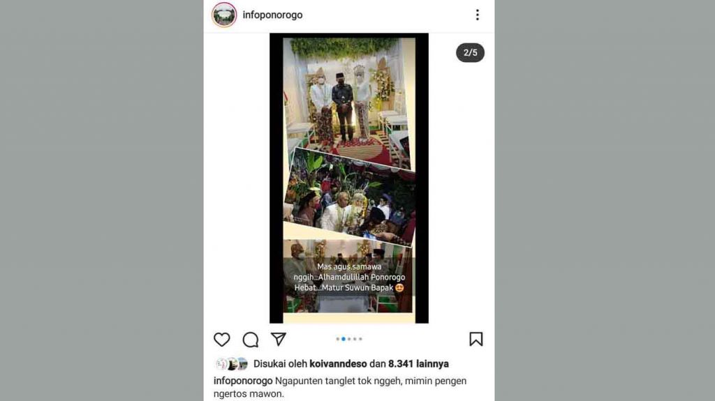 "Ngapunten tanglet tok nggeh, mimin pengen ngertos mawon nopo angsal ndamel acara nikahan sampunan nggeh. Soal e dekwingi dereng angsal, kok wonten acara? Pripun nggeh asline niku? (Mohon maaf tanya saja, admin ingin tahu saja apakah sudah boleh mengadakan acara nikahan. Soalnya kemarin belum boleh. Kok ada acara ini? Sebenarnya seperti apa aslinya)," tulis akun @infoponorogo.