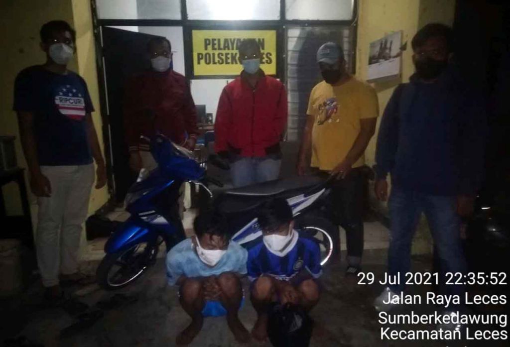 "Mereka kepergok menuntun sepeda motor tanpa plat nomor dan tidak dilengkapi kunci di Jalan Raya Leces tepatnya di Desa Malasan Kulon oleh kami. Karena gerak-geriknya mencurigakan, kami kemudian mencegatnya," kata Kanitreskrim Polsek Leces, Aipda Eko Apriyanto, Jumat (30/7/2021).