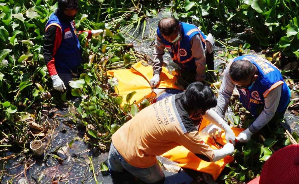 Jenazah yang mengenakan baju hitam dengan celana hitam kombinasi biru ditemukan di tumpukan eceng gondok oleh Basori, salah satu warga.