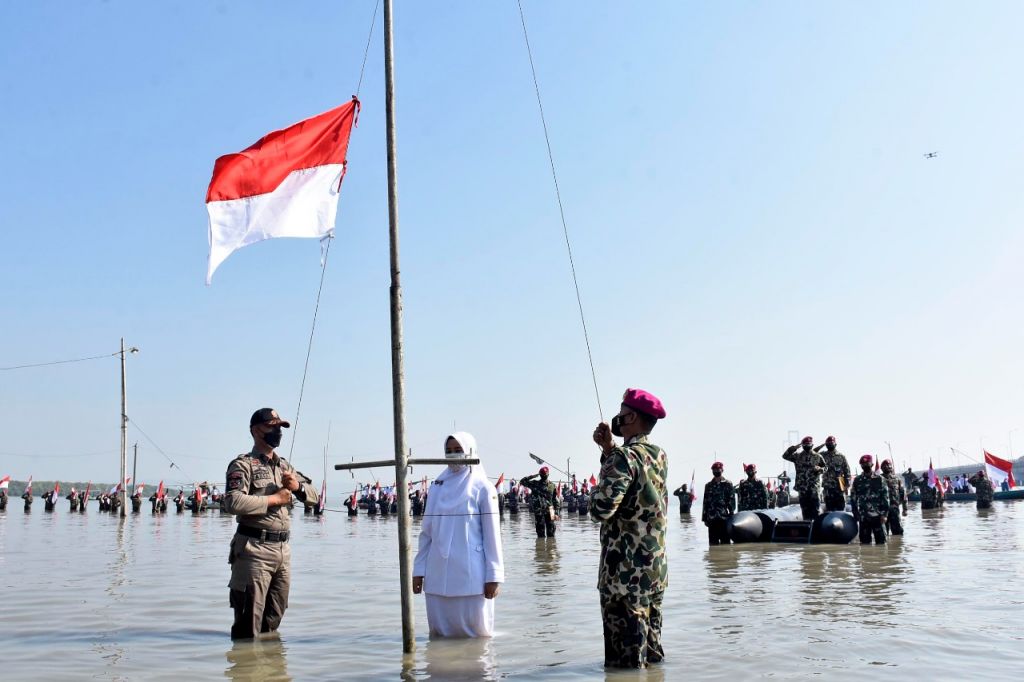 Momen ini memang spesial, karena dilaksanakan di pesisir pantai dan melibatkan berbagai elemen masyarakat khususnya masyarakat pesisir. Semua peserta membawa Bendera Merah Putih termasuk nelayan mengibarkan bendera di perahu mereka.