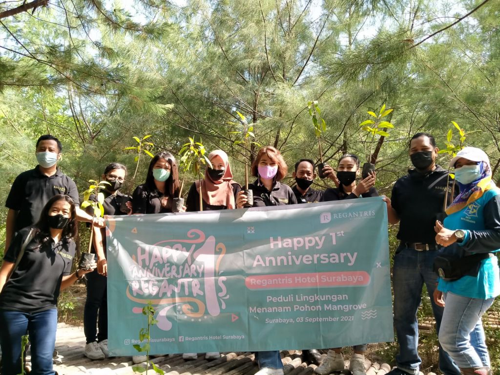 jatimnow.com - Memperingati Anniversary pertama, Regantris Hotel Surabaya menggelar aksi peduli lingkungan dengan menanam bibit mangrove di Mangrove Botanical Garden Gunung Anyar, Surabaya, Jumat (3/9/2021).