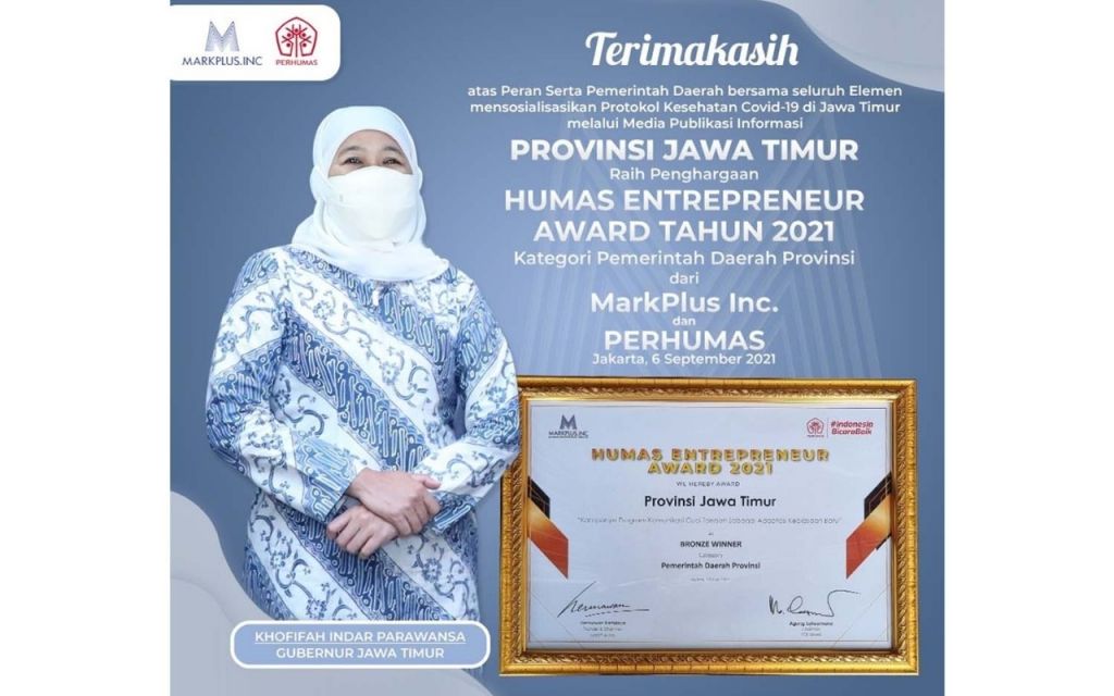 jatimnow.com - Pemprov Jatim raih anugerah Humas Enterpreneur Awards tahun 2021 dari MarkPlus Onc dan PERHUMAS. Penghargaan ini atas upaya sosialisasi program komunikasi protokol kesehatan (prokes) Covid-19 sebagai adaptasi kebiasaan baru.