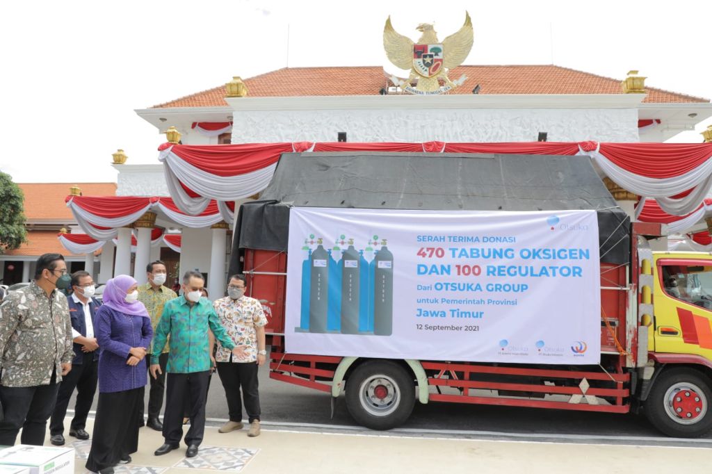 jatimnow.com - Otsuka Grup memberikan donasi 470 tabung oksigen dan 100 unit regulator kepada Pemerintah Provinsi (Pemprov) Jawa Timur, Minggu (12/9/2021).