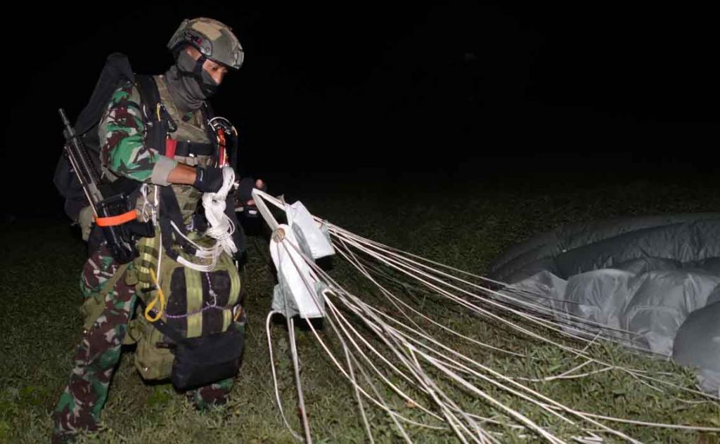jatimnow.com - Prajurit Batalyon Intai Amfibi 2 Marinir (Yontaifib 2 Mar) Pasmar 2 Korps Marinir melaksanakan terjun tempur di Desa Banyuputih, Kecamatan Asembagus, Kabupaten Situbondo, Senin (13/9/2021) dinihari.
