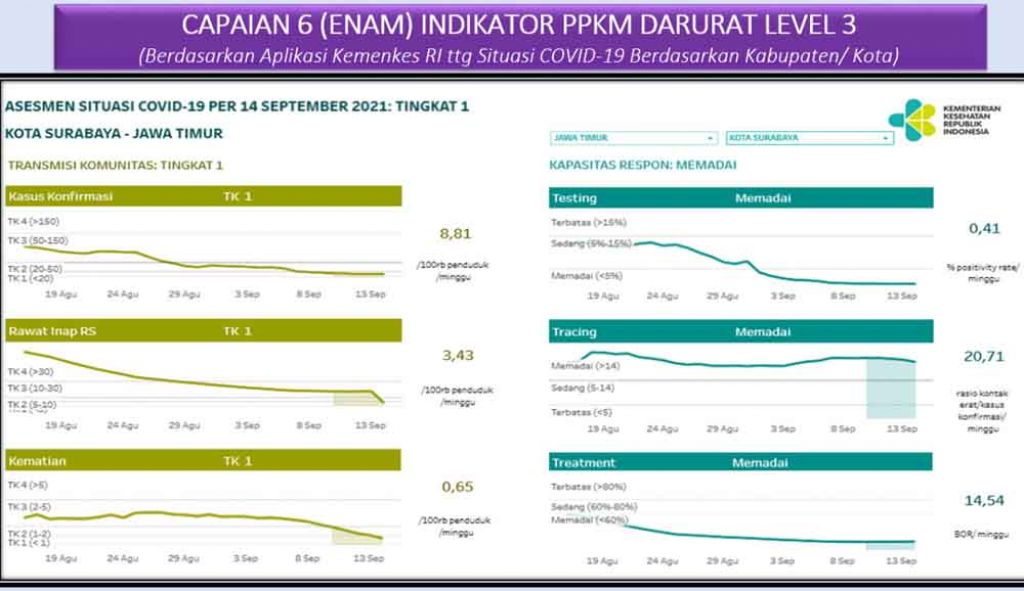 Enam indikator penilaian itu, terbagi menjadi Transmisi Komunitas dan Kapasitas Respon. Untuk Transmisi Komunitas, kasus konfirmasi per 100.000 penduduk di Surabaya saat ini 8,81 (tingkat 1).