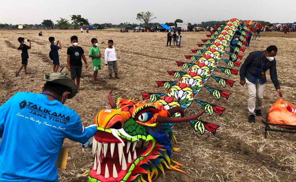 Dengan ukuran tersebut tak heran jika layangan bentuk naga membutuhkan minimal 4 orang saat menerbangkannya.