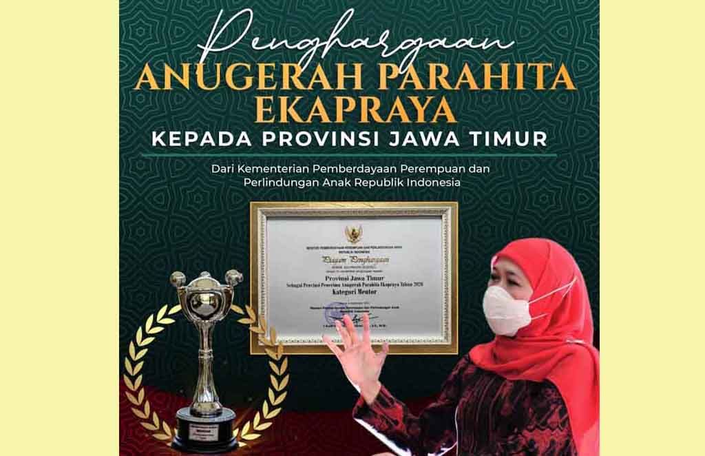 jatimnow.com - Pemerintah Provinsi (Pemprov) Jawa Timur meraih penghargaan Anugerah Parahita Ekapraya (APE) Tahun 2021 kategori mentor dari Kementerian Pemberdayaan Perempuan dan Perlindungan Anak (Kemen PPPA).