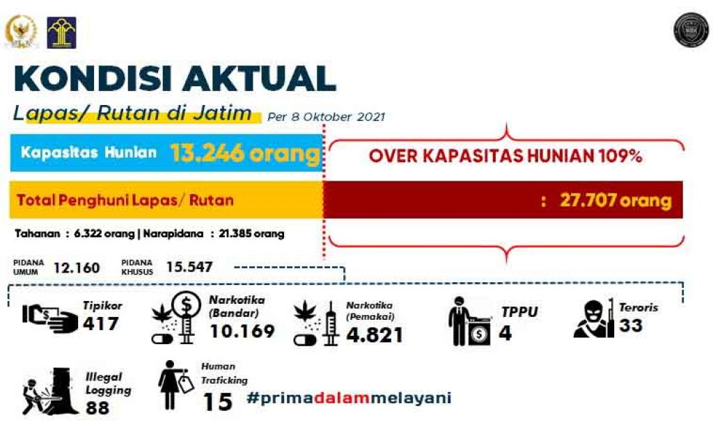 Kepala Kanwil Kemenkumham Jatim, Krismono menjelaskan per Oktober Tahun 2021, dari 39 lapas/rutan di Jatim dihuni sekitar 27.707 warga binaan. Jumlah itu melebihi kapasitas hunian yang ‘hanya’ mampu menampung 13.246 orang saja.