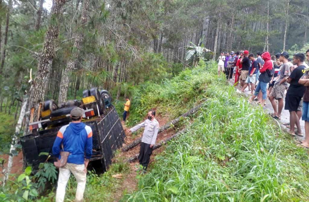 Ponorogo - Sebuah truk tanpa muatan terguling ke dalam tikungan tebing yang berada di kawasan Hutan Ngrayun, Ponorogo.