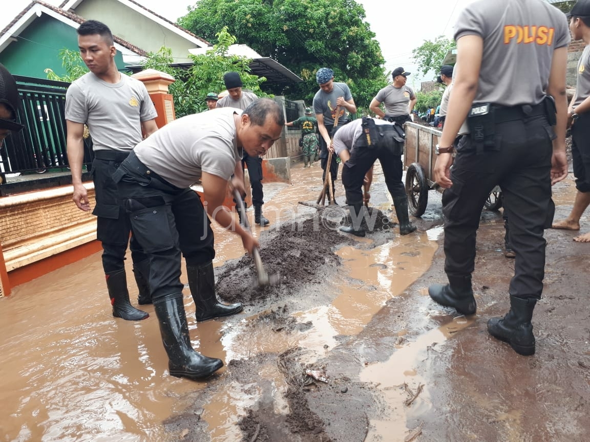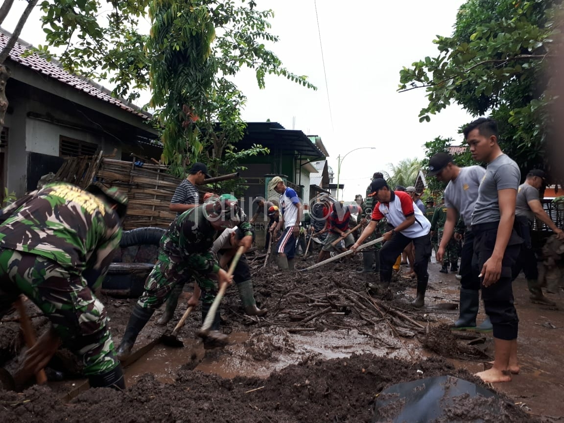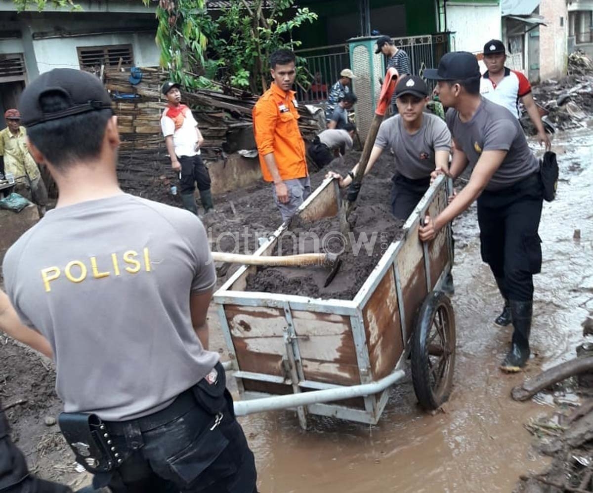 Polisi dan tentara membersihkan saluran air, rumah penduduk, jalan kampung, jalan raya yang masih terendam material banjir. Material yang paling banyak adalah lumpur, pasir dan batang pohon.