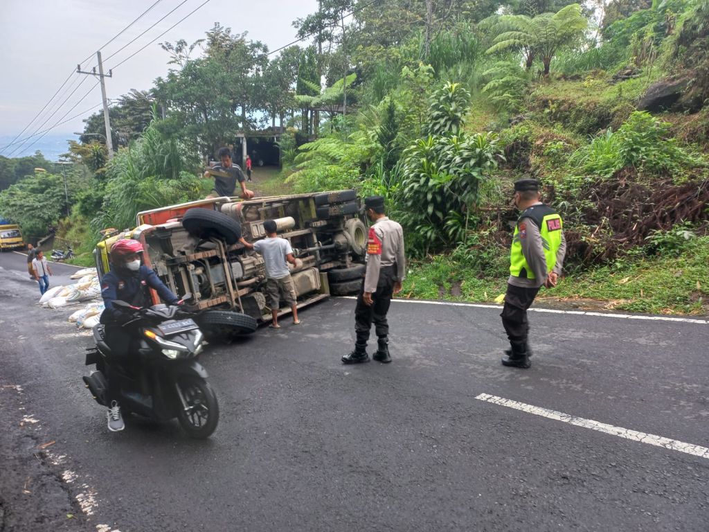 Terjadi kecelakan lalu lintas melibatkan sebuah bus yang oleng dan terguling hingga menewaskan seorang pemotor.