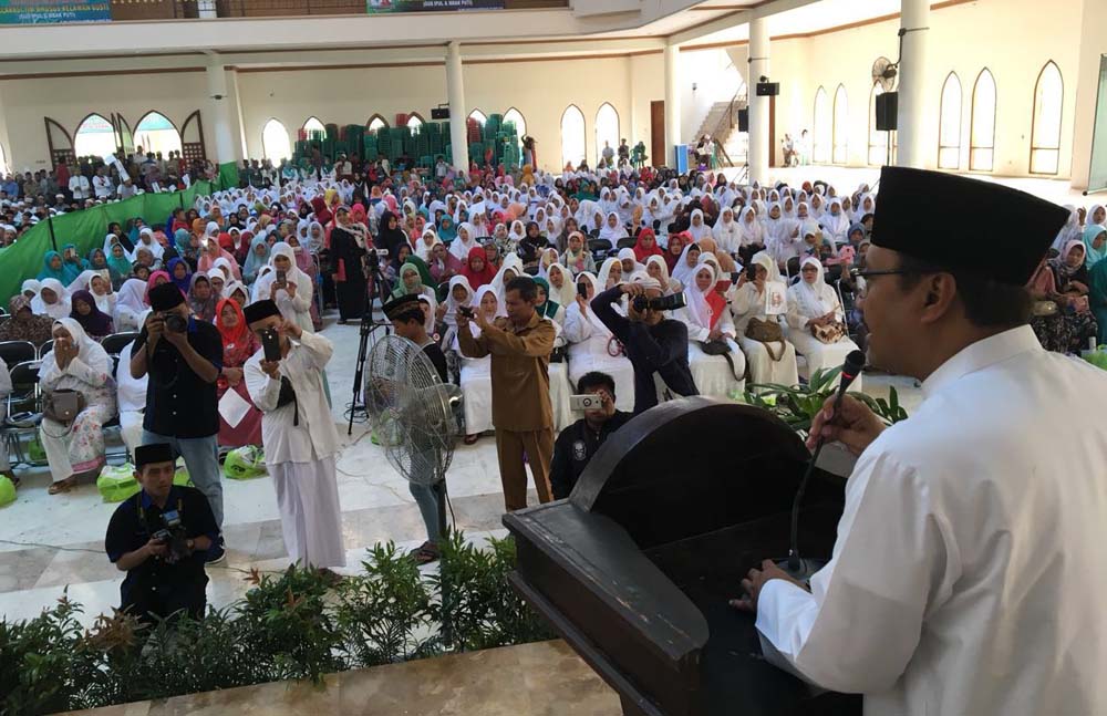 Relawan-relawati memulai janji baiat dengan pembacaaan basmallah dan Ayat Suci Al Quran. Baiat ini dipimpin oleh ulama senior Pamekasan, KH Mudassir Badruddin, pengasuh Pondok Pesantren Miftahul Ulum, Penyeppen di gedung Islamic Center, Pamekasan, Senin (5/3/2018).