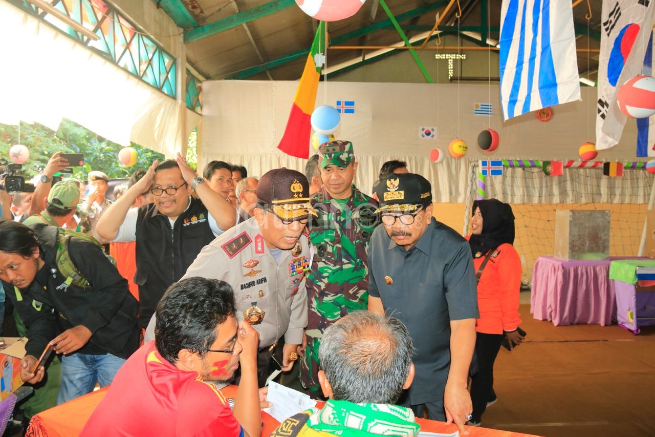Pejabat forpimda ini menyalami masyarakat yang sedang antre menunggu panggilan petugas KPPS. Sedangkan petugas KPPS berdandan ala suporter sepakbola dari berbagai negara peserta Piala Dunia 2018, juga disapa Pakde Karwo, Kapolda dan Pangdam.