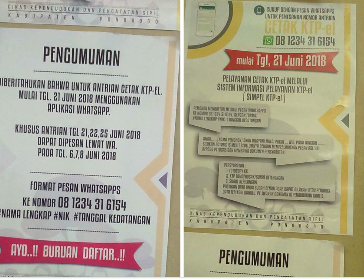 jatimnow.com - Inovasi cetak Kartu Tanda Penduduk (KTP) Elektronik atau biasa dikenal dengan E-KTP harus mendaftar melalui nomor whatsapp di Kabupaten Ponorogo viral di media sosial.