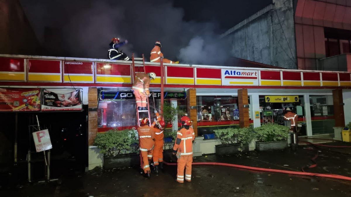 Surabaya - Sebuah minimarket Alfamart di Jalan Diponegoro, depan SPBU setelah flayover Pasar Kembang, Surabaya, terbakar, Sabtu (23/4/2022). Para pelanggan hingga karyawan yang mengetahui kebakaran langsung berhamburan keluar.