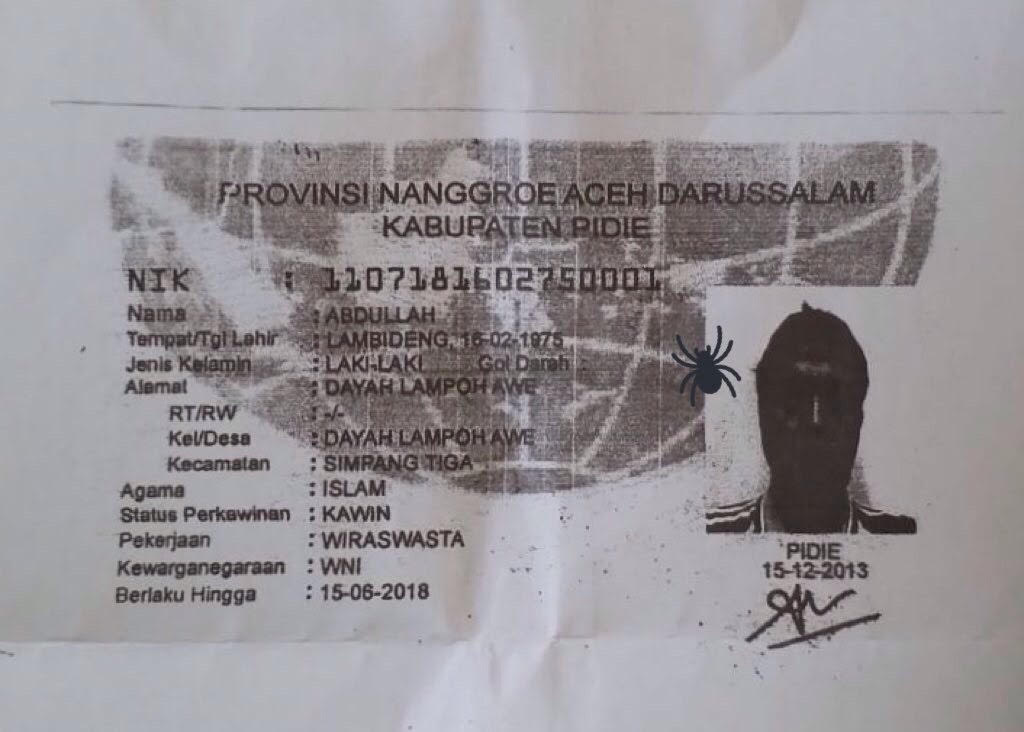 Kemudian pada KTP kedua tertera nama Abdullah dengan alamat Desa Dayah Lampoh Awe, Kec. Simpang Tiga, Kab. Pidie, Provinsi Aceh.