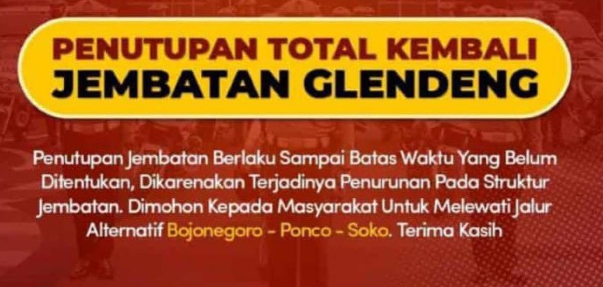 Bojonegoro - Jembatan Glendeng yang berada di Desa Simo Kecamatan Soko Kabupaten Tuban akan ditutup total mulai hari ini, Sabtu (21/5/2022) pukul 10.00 WIB. Imbasnya, akses yang menghubungkan Tuban-Bojonegoro pun ikut dialihkan.