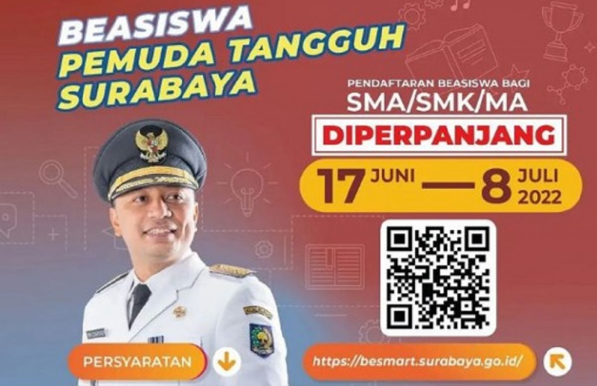 Surabaya - Pemerintah Kota (Pemkot) Surabaya memperpanjang masa pendaftaran beasiswa Pemuda Tangguh Surabaya yang dikhususkan bagi jenjang SMA/SMK/MA sederajat. Beasiswa tersebut diharapkan dapat mengentas pemuda Surabaya yang putus sekolah.
