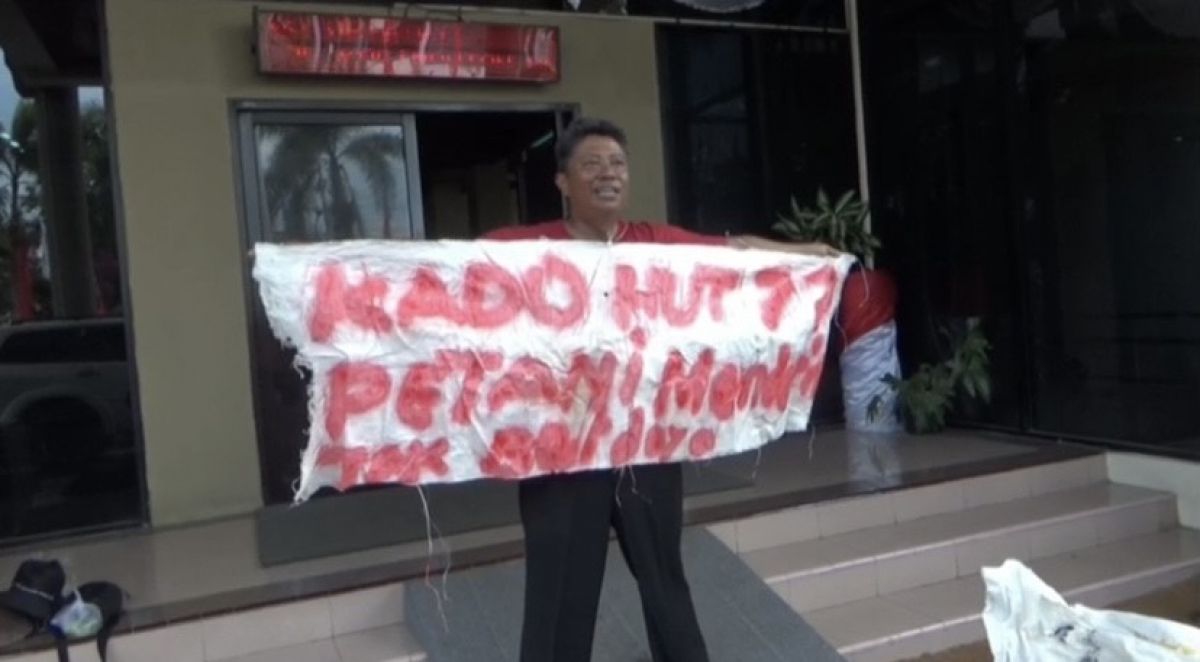 “Hari ini saya sebagai petani, naik sepeda ontel dari rumah ke DPRD, untuk titip pesan bagi Pak Presiden dan wakil rakyat di pusat. Bahwa dengan adanya kebijakan pencabutan pupuk subsidi menjadi kado istimewa bagi petani di HUT ke-77 RI. Bukan petani semakin berdaya, tapi petani semakin menderita," ujar Jumantoro.