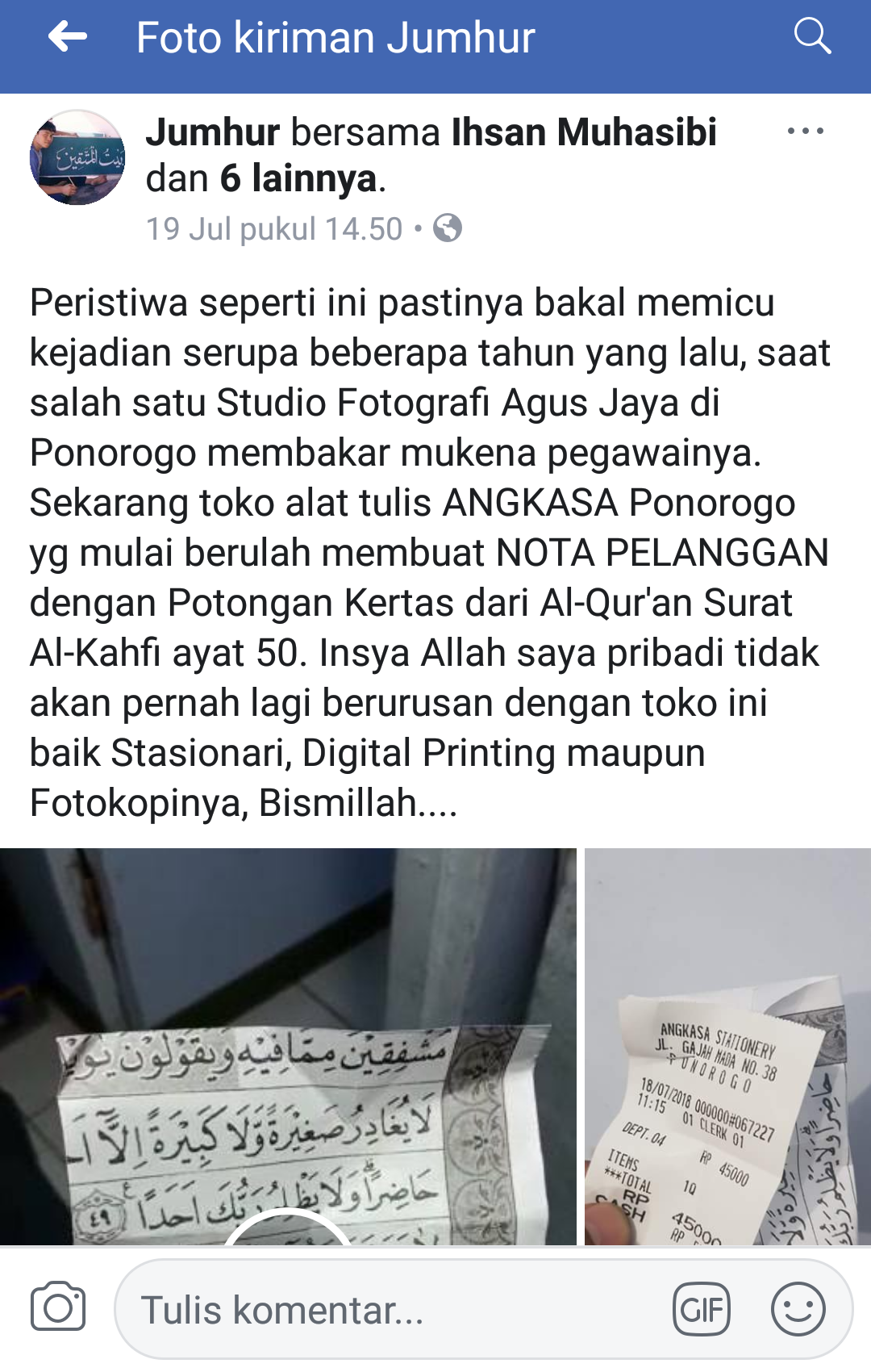 "Sekarang toko alat tulis ANGKASA Ponorogo yang mulai berulah membuat NOTA PELANGGAN dengan Potongan Kertas dari Al-Qur'an Surat Al-Kahfi ayat 50. Insya Allah saya pribadi tidak akan pernah lagi berurusan dengan toko ini baik Stasionari, Digital Printing maupun Fotokopinya, Bismillah....".