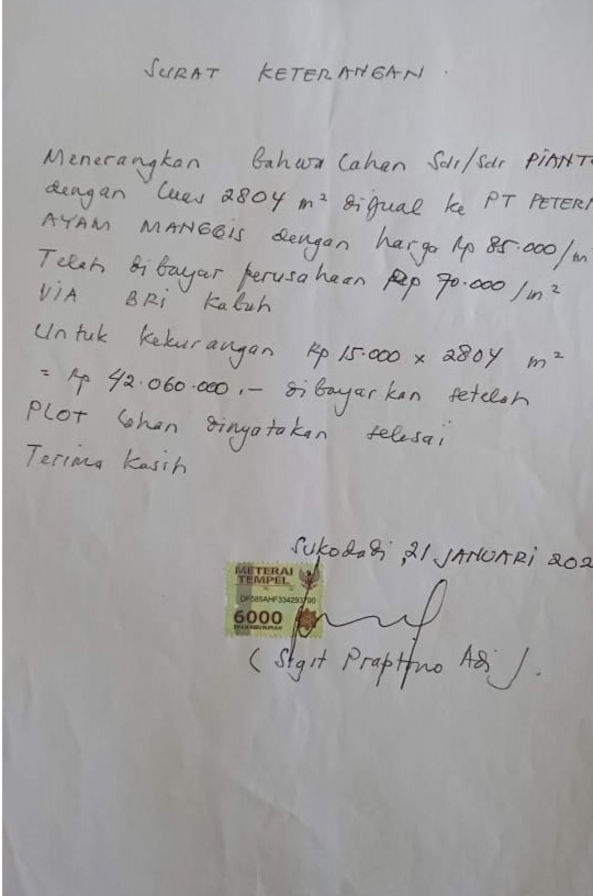 "Untuk harga itu yang tahu pihak adalah mediator (Sulistiowati dan Sigit), warga dan pihak perusahaah. Harganya memang berfariasi. Tapi saya tidak bisa menyebut berapa-berapanya," ungkapnya.