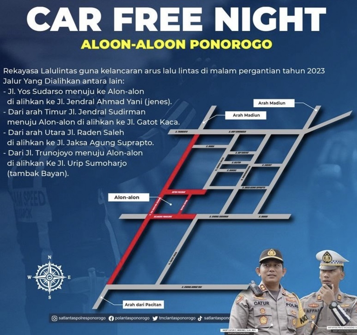 Sehingga mereka yang dari Jalan Yos Sudarso menuju ke Alun-Alun Ponorogo dialihkan ke Jalan Jendral Yani. Dari arah timur Jalan Jendral Sudirman menuju alun-alun dialihkan ke Jalan Gatotkaca.
