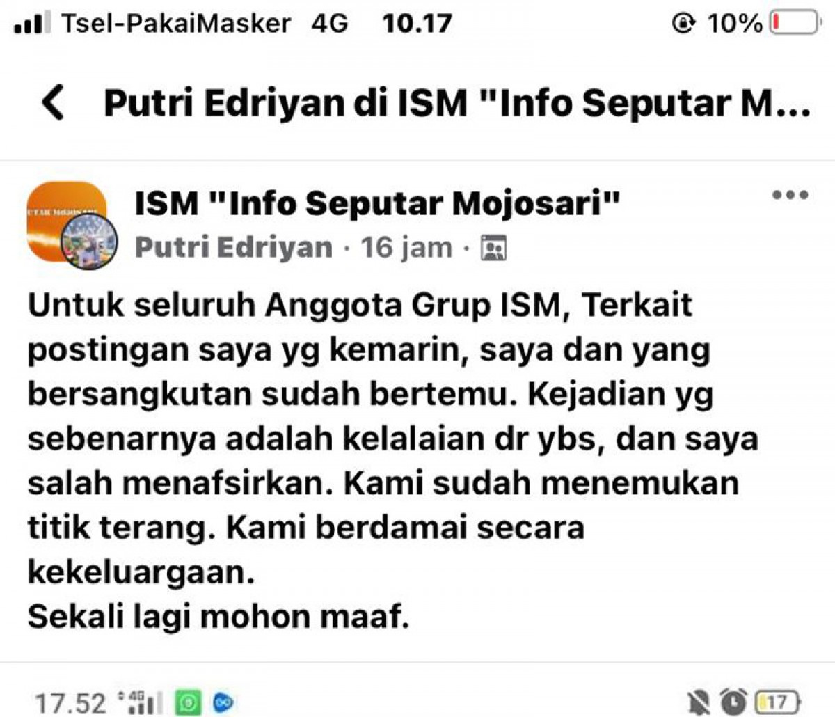 "Untuk seluruh Anggota Grup ISM, Terkait postingan saya yg kemarin, saya dan yang bersangkutan sudah bertemu. Kejadian yg sebenarnya adalah kelalaian dr ybs, dan saya salah menafsirkan. Kami sudah menemukan titik terang. Kami berdamai secara kekeluargaan. Sekali lagi mohon maaf," tulis akun Putri Edriyan seperti dilihat jatimnow.com, Kamis (2/2/2023).
