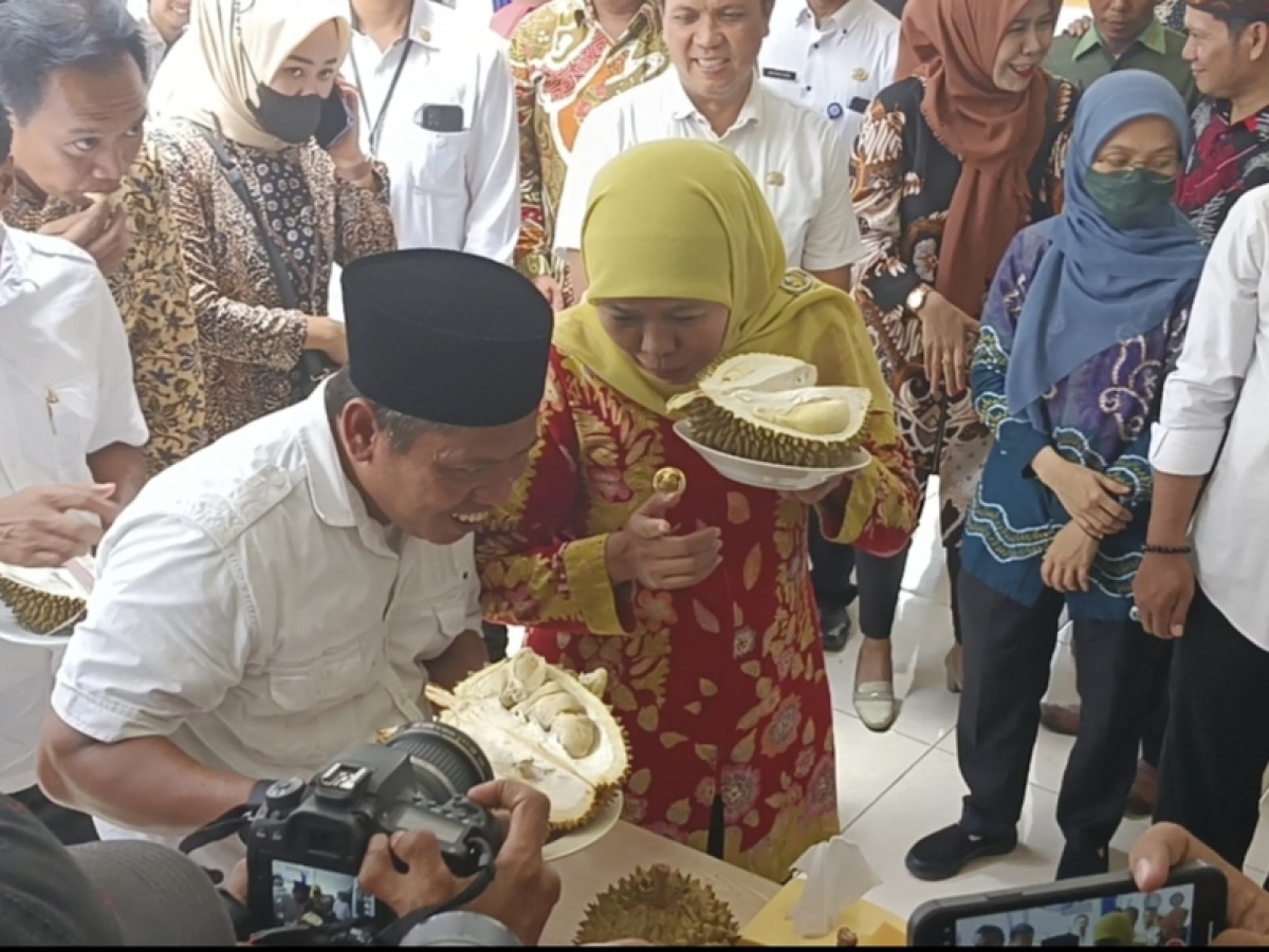 Di lokasi, Khofifah tampak sumringah melihat puluhan duren di atas meja, yang masih berbalut kulit duren yang keras, dan ia tergopoh ingin membelahnya.