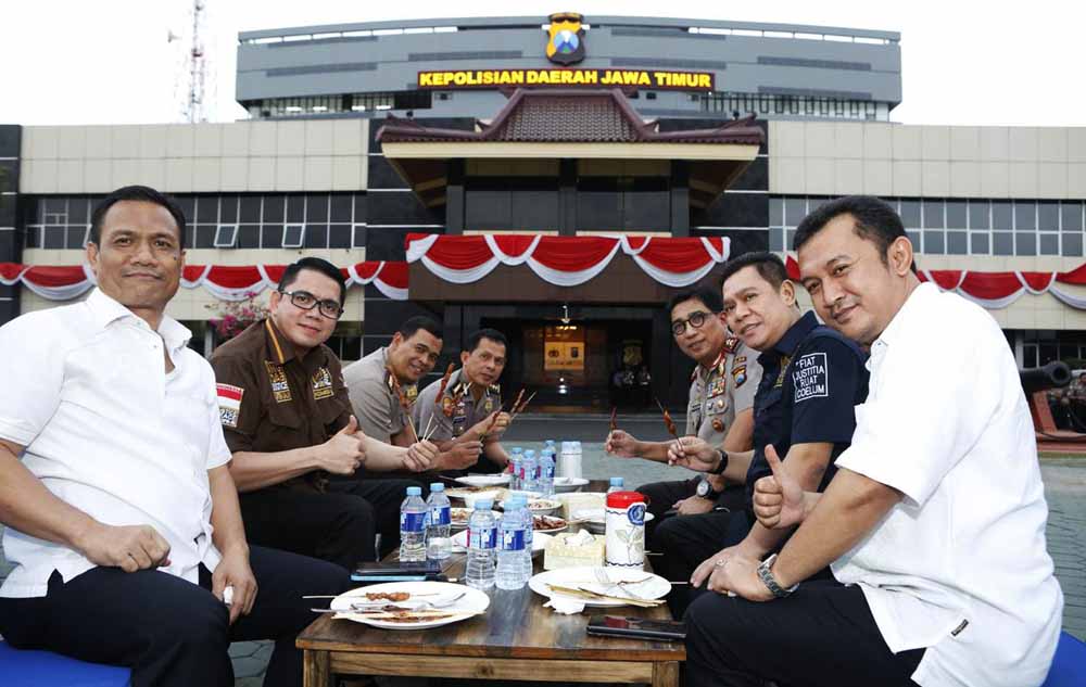 Mereka duduk santai di halaman di luar gedung Tri Brata (ruang kerja Kapolda Jatim).