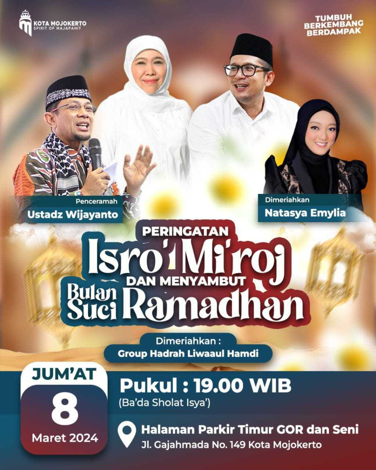 jatimnow.com - Pemkot Mojokerto menggelar pengajian akbar bersama Ustaz Wijayanto di halaman parkir timur GOR dan Seni Mojopahit, Jalan Gajah Mada 149, Kota Mojokerto, Jumat (8/3/2024) nanti malam.