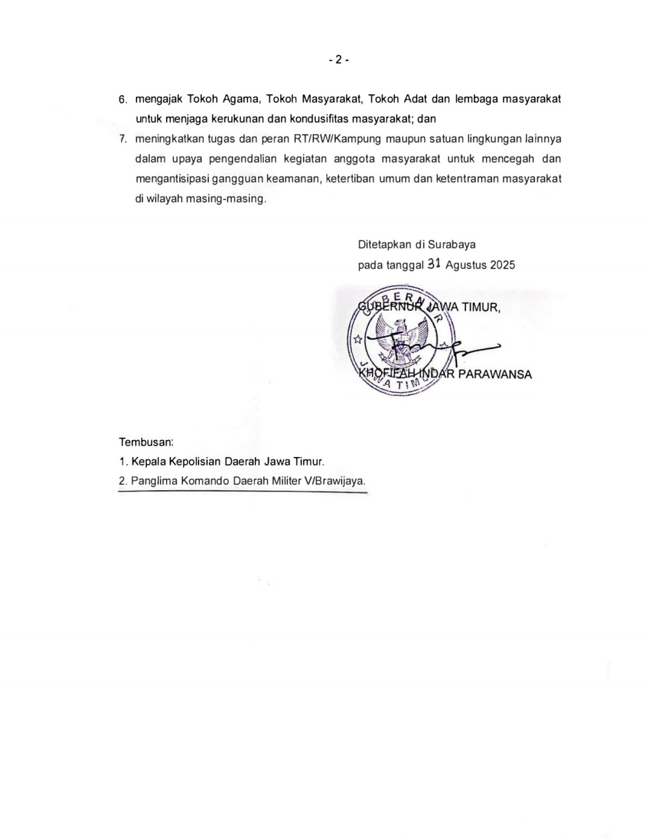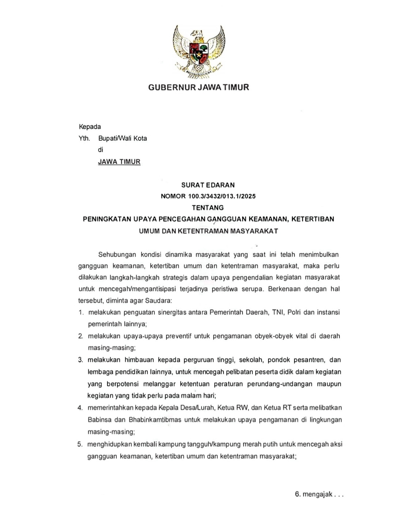 SE tersebut tertuang dalam nomor 100.3/3432/013.1/2025 yang diterbitkan di Surabaya, pada Minggu (31/8/2025).