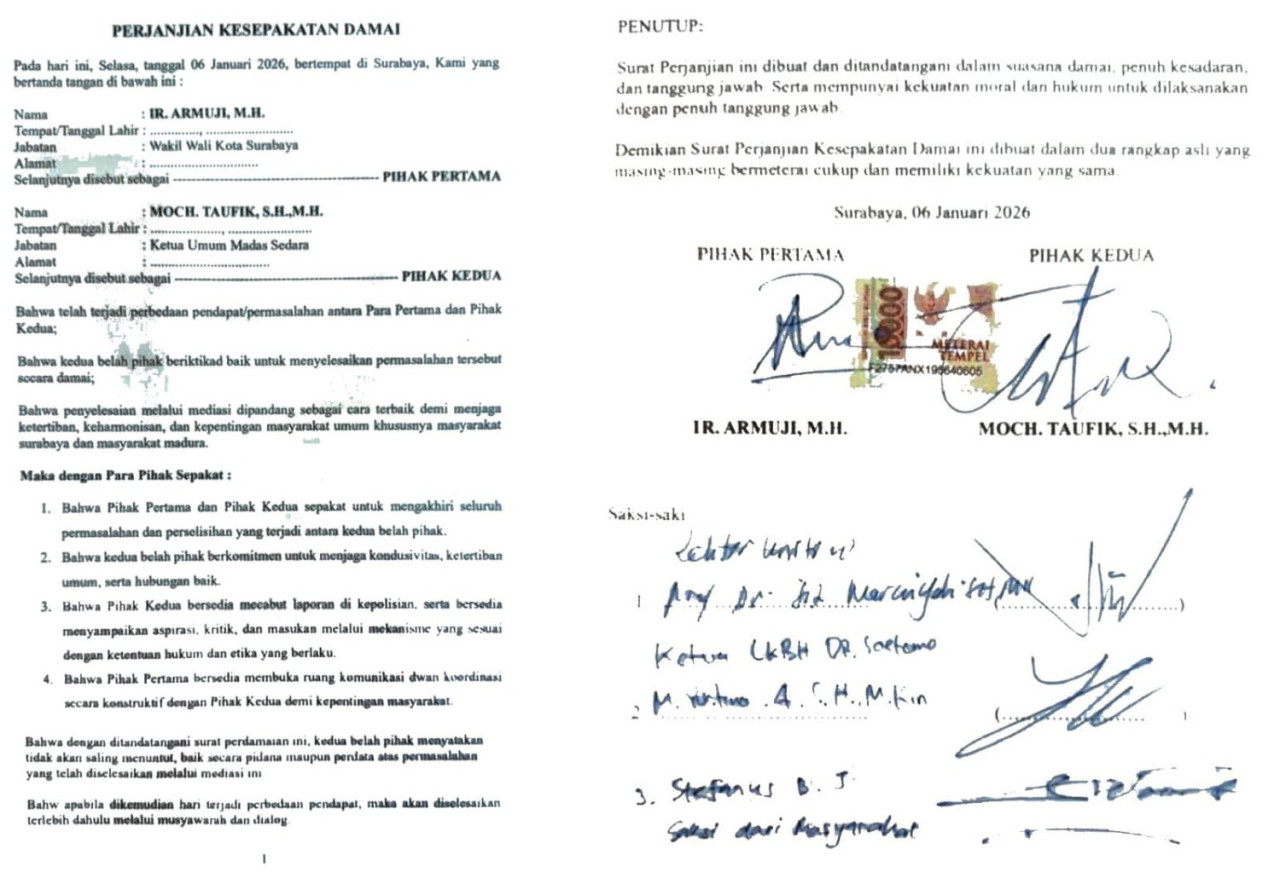 Kesepakatan damai Armuji dan Madas dituangkan dalam surat perjanjian bermeterai yang ditandatangani kedua pihak.